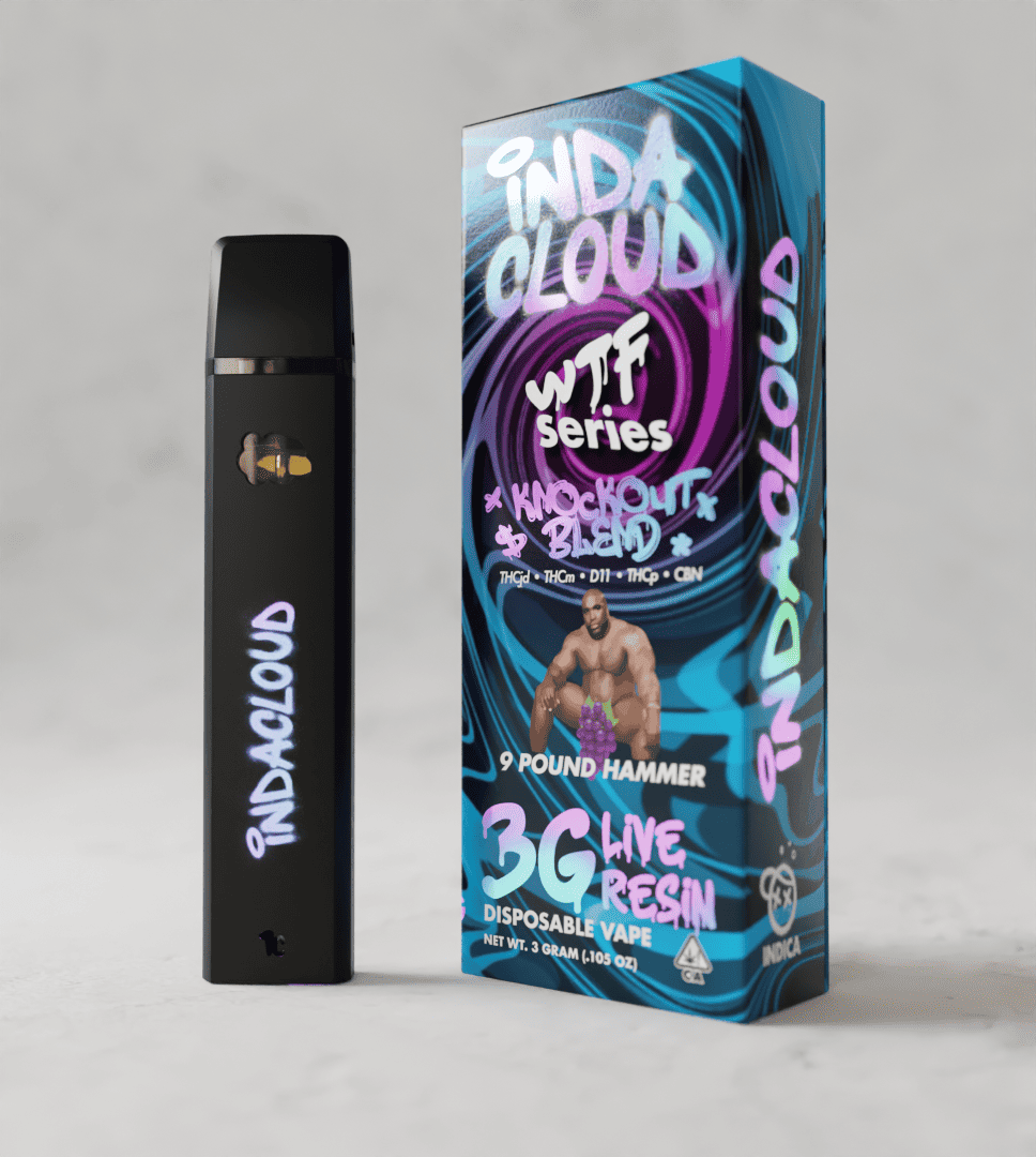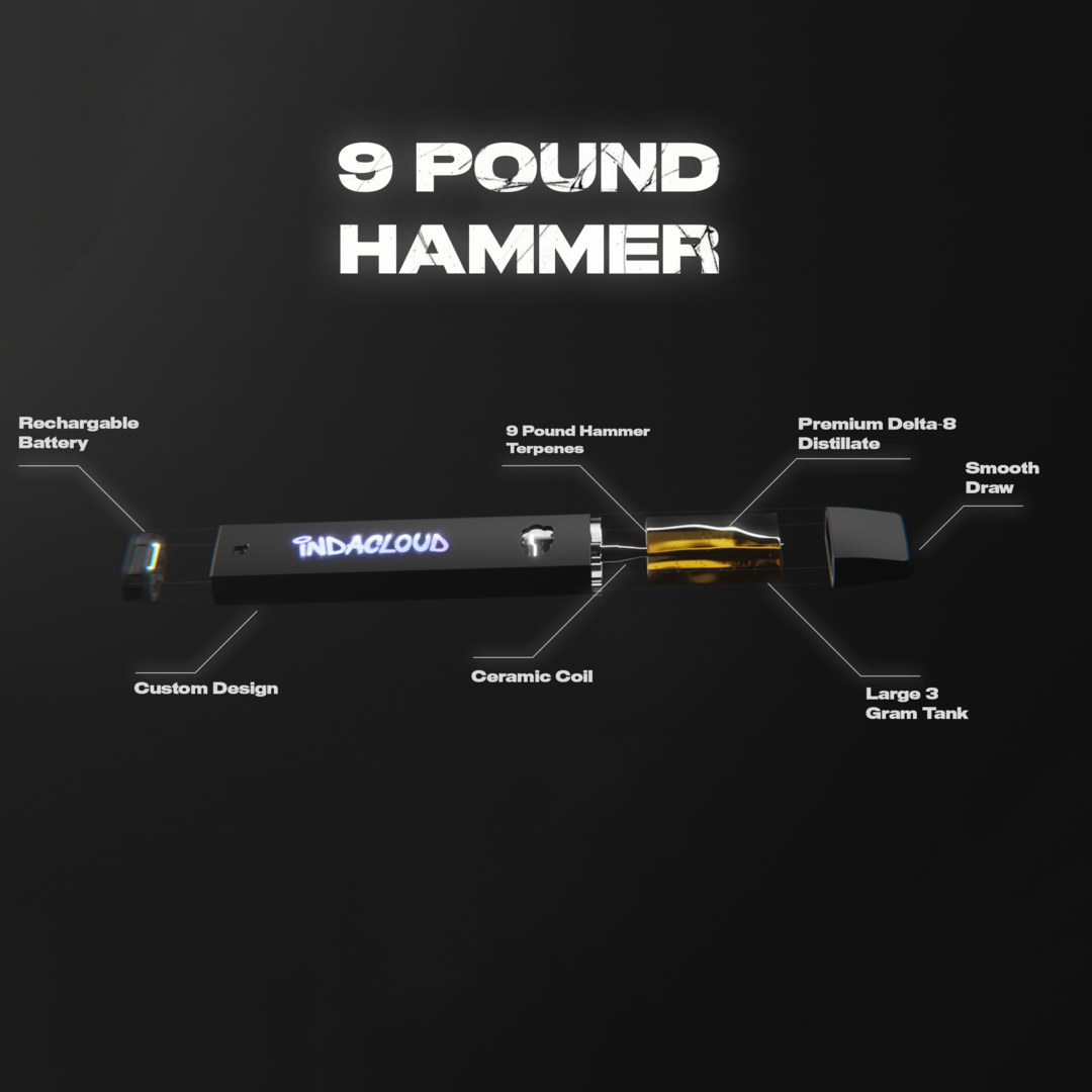 The 9 Pound Hammer WTF Series from Indacloud stands out from other vape products due to its unique combination of absurd names, potent effects, size, and flavorful strain. Indacloud's WTF Series has pushed the boundaries of the vaping experience, offering a strong blend of rare cannabinoids, a delightful flavor profile, and a massive 3-gram disposable vape. This combination delivers a vaping experience that prompts an astonished "WTF?" from users, as the name aptly suggests.